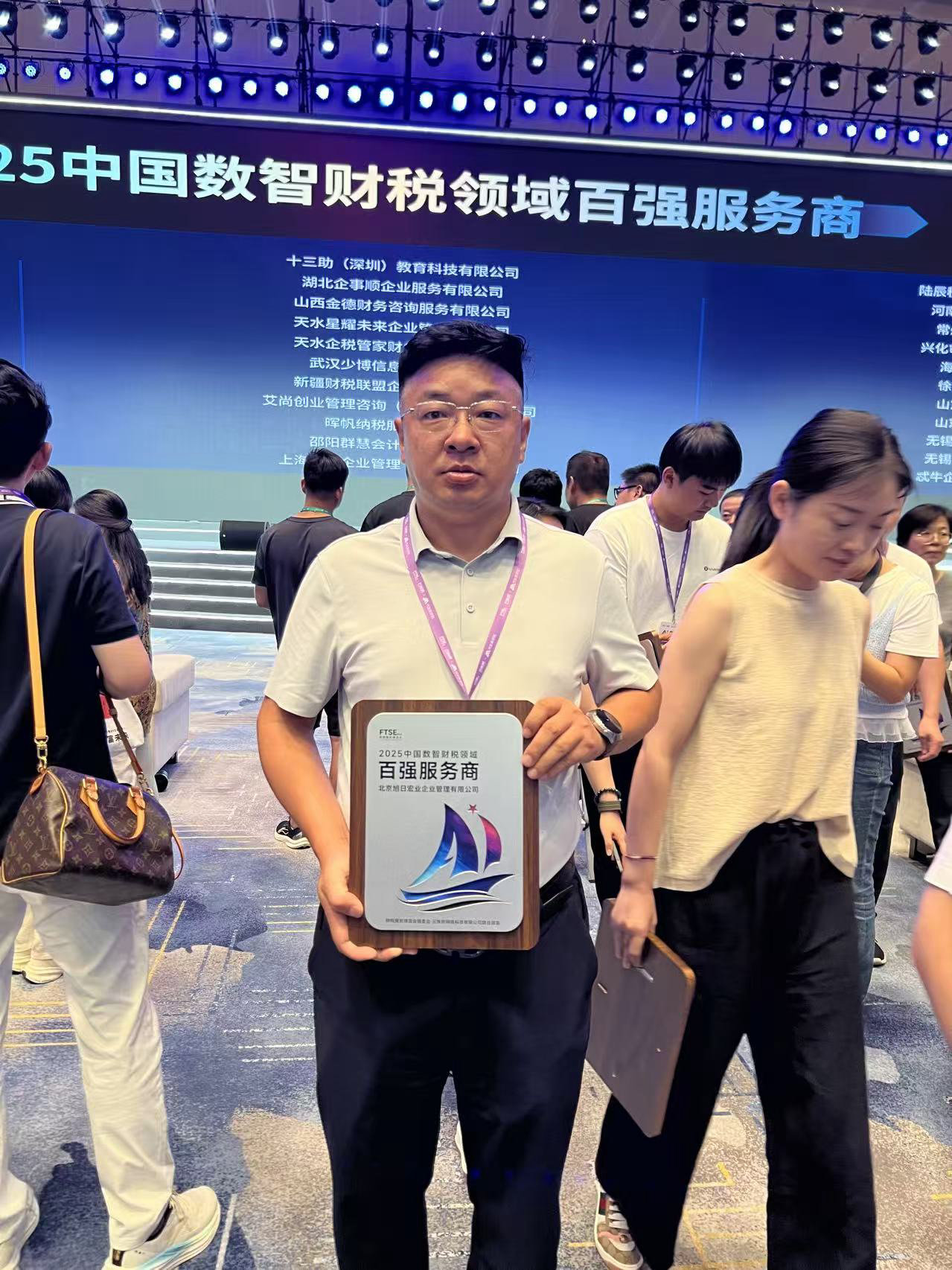 2025 年 8 月 15-16 日,无锡国际会议中心 —— 北京旭日宏业企业管理有限公司(以下简称 “旭日宏业”)在 2025 第六届财税服务博览会(简称 “第六届财博会”)上再度荣获 “2025 中国数智财税领域百强服务商” 称号。公司总经理史凤来先生受邀出席本次行业盛典,与全国财税领域精英共探 AI 时代下的财税服务创新之路。